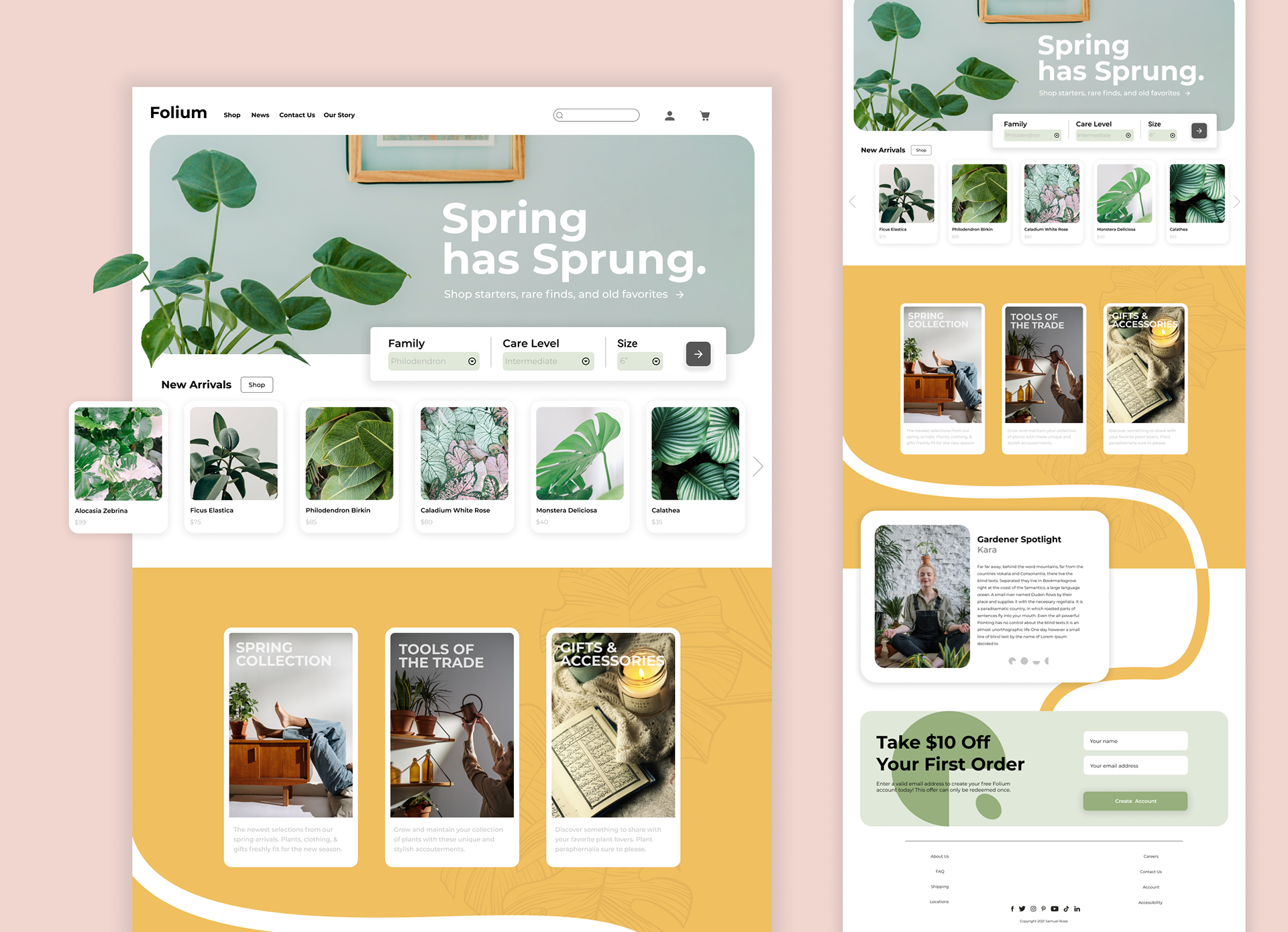 Folium is a concept e-commerce platform for the sale of houseplants and plant care related items. This landing page design features options to select plants using multiple criteria, promoted feature categories, and a customer spotlight.