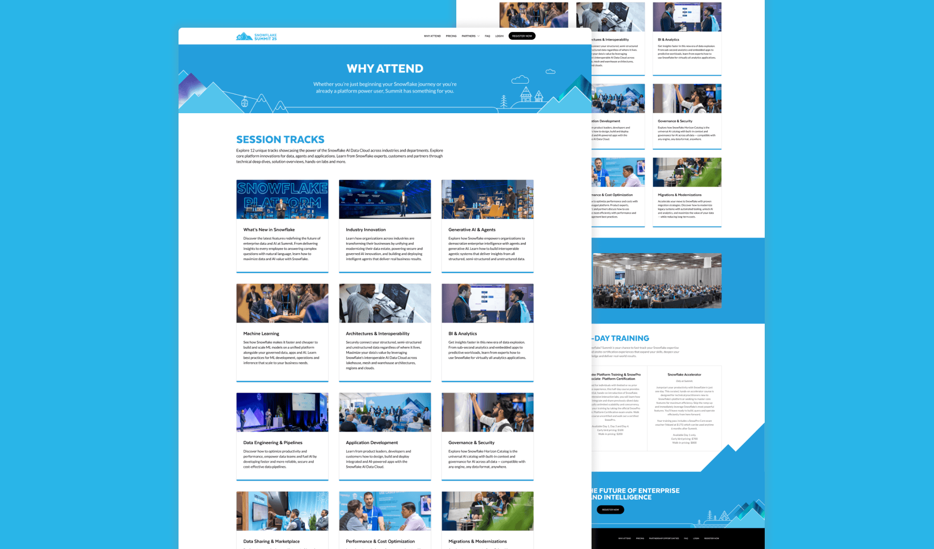 For every iteration of the event, I led the design and rollout of the conference website across pre-event, live, and post-event phases. In addition, I designed large-scale environmental graphics used throughout the event space, assets and screens for the event mobile app used by all attendees, as well as other digital collateral for social media and Snowflake.com.